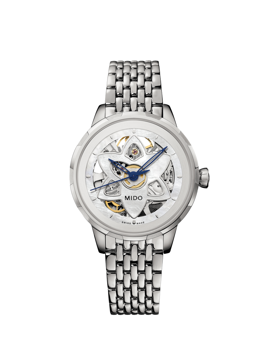 For the first time, Mido has created a skeleton Swiss watch especially dedicated to women. The new and audacious Rainflower Blossom features delicate lines, directly inspired by the lotus flower shape of Singapore’s contemporary ArtScience Museum. Resolutely feminine petals are interlaced along the edges. Adorned with an openwork flower, the captivating dial reveals at its centre the Caliber 80 – the latest-generation automatic movement, whose mainplate has been specially skeletonised and decorated. It invites the wearer to marvel at the passing of time with audacityand elegance.