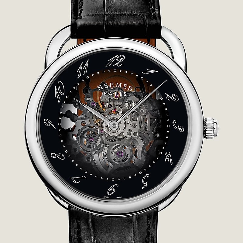 Stainless steel watch, self-winding movement, gradient black mineral crystal dial, transparent dial center, black matte alligator leather replaceable long strap