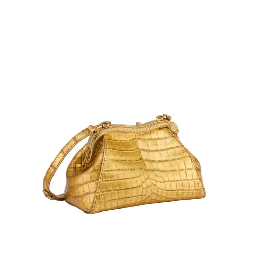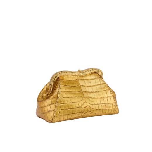 The precious Serpentine series small clutch bag is handcrafted from golden soft crocodile leather and cleverly decorated with 24K gold foil, which is in line with Bulgari’s jewelry style. The handbag combines soft and fashionable shapes with jewelry element details, which are reminiscent of the graceful and agile posture of the snake, boldly interpreting timeless and classic style. Inspired by the bold and unruly Serpenti series antique archival necklace of the 1960s, its gold-plated brass snake-shaped frame is made of 3-micron plated 24K gold, a special tribute to Bulgari's gold decoration craftsmanship. The handbag embodies a variety of styles - a curved metal top, engraved scales on the front and red enamel eyes, elegant and charming; glossy crocodile leather inserts on the back for a casual style. Featuring a single compartment with snap-button closure and leather shoulder strap, a metal plaque on the inside engraved with the Bulgari logo and the Bulgari metal logo on the back. 19.5 x 14 x 10 cm - 7.7 x 5.5 x 3.9 inches. made in Italy.