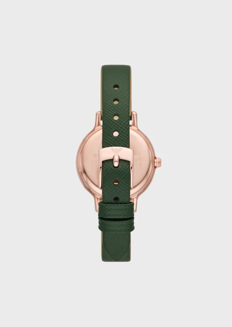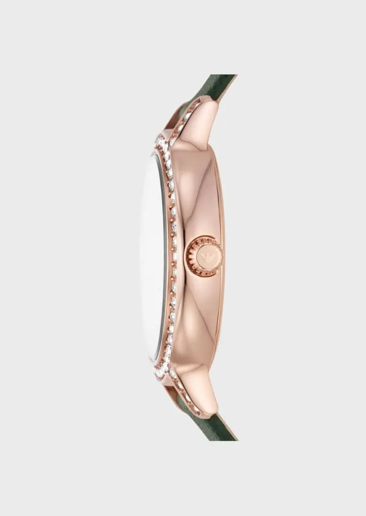 This EMPORIO ARMANI quartz watch uses dark glossy mother-of-pearl as the dial base, with rose gold three-hand embellishment, Roman numerals and crystal surround combinations, echoing the bright pavé bezel, elegant and charming. The sleek and polished retro case, paired with a textured leather wristband, decorates the wrist, interpreting the charm of a fashionable lady.